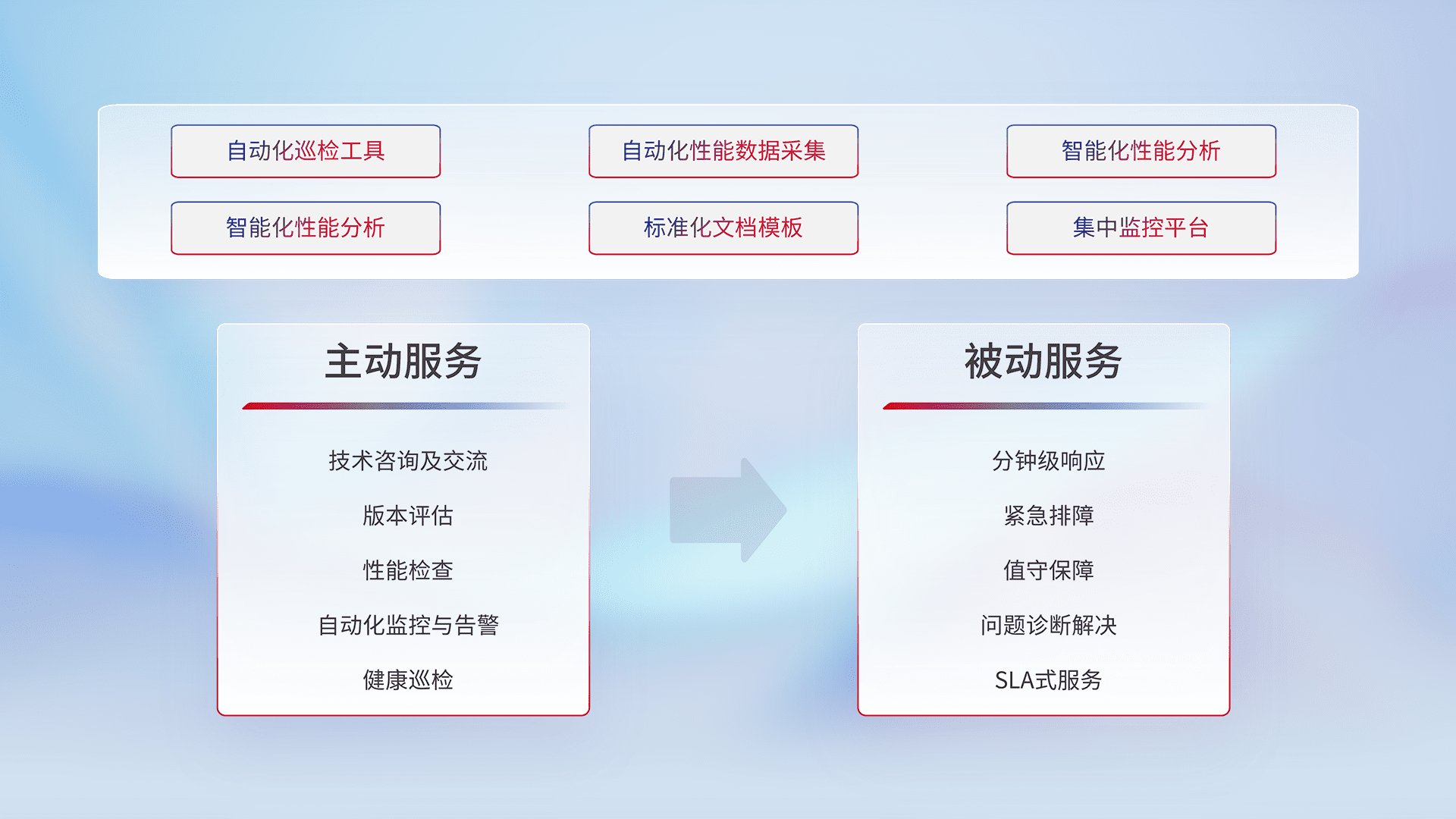 智能化工具和标准化文档,,,,保障服务质量,,,,提供主动服务(包含技术咨询、、、版本评估、、性能检查、、、、自动化监控与告警、、、健康巡检)和被动服务包含(分钟级响应、、紧急排障、、值守保障、、、问题诊断解决、、SLA服务)。。。。